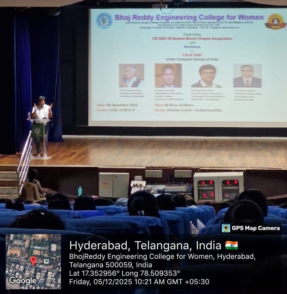 Bhoj Reddy Engineering College for Women, in collaboration with the Computer Society of India (CSI), Hyderabad Chapter, organized the CSI AI 100K Workshop along with the CSI Student Branch Chapter (2025–26) Inauguration on 05 December 2025. The AI 100K initiative, recognised as the world’s largest AI readiness programme, aims to train one lakh students in Artificial Intelligence fundamentals and applied skills. The event was conducted exclusively for first-year students to introduce them to CSI activities, AI learning opportunities, and industry expectations related to digital transformation. Participants: I B Tech CSE, CSM & IT Students Inaugural Session The inaugural session commenced at 09:30 AM on December 5, 2025, graced by eminent dignitaries: Chief Guest, Dr D V Ramana, Secretary, CSI Hyderabad Chapter Guest of Honour, Mr Yadunandan STVSS, VP – Hexaware Technologies & CTO – OneAutoMax Distinguished Guest Speaker, Dr Kalyan Sarvepalli, Senior Digital Transformation Specialist, Infosys AI 100K Programme Manager, Mr Sai Bhanu Madhav, Principal Consultant, Infosys Dr. Sudha Vepa, Secretary, SLV Dr. Ch. Sujatha Gangadhar, Chief Operating Officer, SLV Dr. Gracy Saila Sree, Director–HR & Academics, SLV Dr G Shyama Chandra Prasad, Principal, BRECW Mr. G. Dayakar Reddy, Vice Principal, BRECW Principal’s Address Dr G Shyama Chandra Prasad, Principal, addressed the gathering and highlighted the importance of early exposure to AI and the role of CSI in building student capabilities. He encouraged students to develop strong technical foundations. Chief Guest Address & CSI SBC Inauguration Dr D V Ramana, Secretary, CSI Hyderabad Chapter, was the Chief Guest for the programme. He formally inaugurated the CSI Student Branch Chapter (2025–26) and spoke about CSI’s contribution to student development, professional ethics, and continuous learning. Distinguished Guest Speaker Dr Kalyan Sarvepalli, Senior Digital Transformation Specialist, Infosys, shared insights on global AI adoption and emphasised the need for computational thinking, data-driven decision-making, and adaptability in modern engineering careers. Guest of Honor Mr Yadunandan STVSS, VP – Hexaware Technologies & CTO – OneAutoMax, interacted with students on emerging industry expectations and essential digital skills. He motivated students to stay curious and technologically aware. Keynote Address – AI 100K Programme The keynote session by Mr Sai Bhanu Madhav, Principal Consultant, Infosys, provided an impactful overview of the CSI AI 100K initiative. He explained the programme’s structured learning path, covering Python, data analytics, machine learning fundamentals, and real-world AI applications. Key Highlights AI Readiness: Importance of gaining AI skills early as industries rapidly adopt intelligent systems. Learning Framework: Multi-level curriculum including Python, ML basics, Generative AI, and practical case studies. Student Opportunities: Assignments, quizzes, and hands-on activities curated by industry experts. Career Pathways: Roles such as Data Analyst, AI Engineer, ML Developer, and Automation Specialist. Ethical AI: Emphasis on responsible data use and societal impact. Continuous Learning: Encouragement to participate in CSI events, hackathons, and peer-learning groups. His session inspired students to engage proactively with AI concepts and utilize the AI 100K initiative for career advancement.