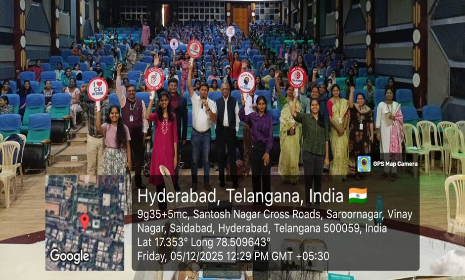 The workshop on “CSI AI 100K” and the CSI Student Branch Chapter Inauguration successfully introduced first-year engineering students to AI concepts, industry expectations, and professional development opportunities. The event strengthened the collaboration between the institution and CSI Hyderabad Chapter and marked the beginning of a year filled with learning, innovation, and student engagement in emerging technologies.