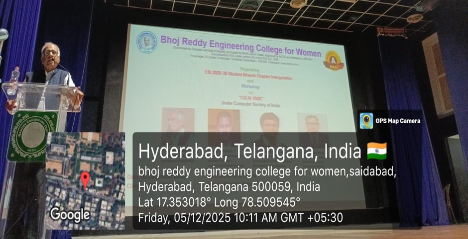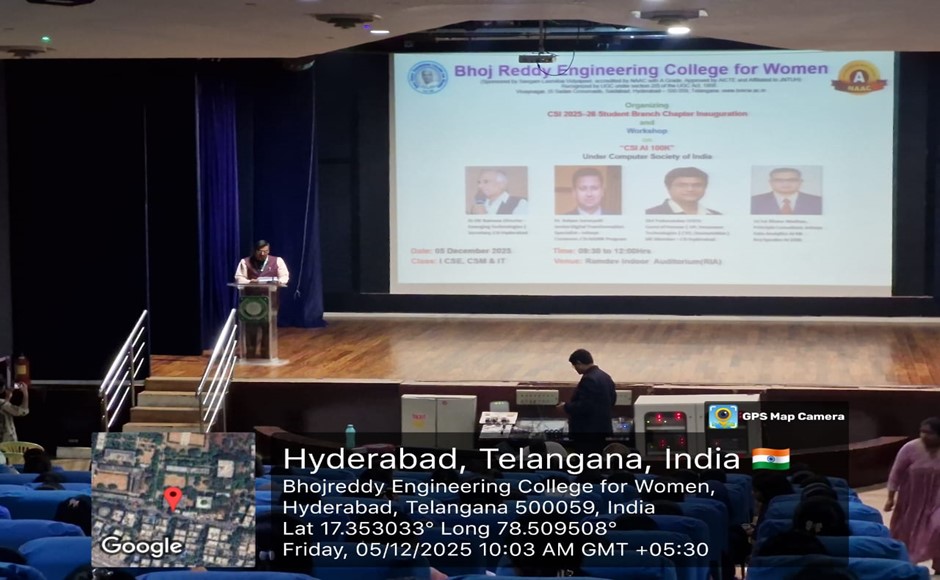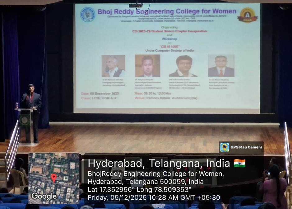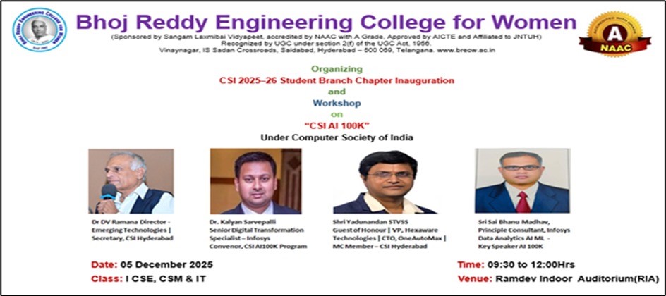 Bhoj Reddy Engineering College for Women, in collaboration with the Computer Society of India (CSI), Hyderabad Chapter, organized the CSI AI 100K Workshop along with the CSI Student Branch Chapter (2025–26) Inauguration on 05 December 2025. The AI 100K initiative, recognised as the world’s largest AI readiness programme, aims to train one lakh students in Artificial Intelligence fundamentals and applied skills. The event was conducted exclusively for first-year students to introduce them to CSI activities, AI learning opportunities, and industry expectations related to digital transformation. Participants: I B Tech CSE, CSM & IT Students Inaugural Session The inaugural session commenced at 09:30 AM on December 5, 2025, graced by eminent dignitaries: Chief Guest, Dr D V Ramana, Secretary, CSI Hyderabad Chapter Guest of Honour, Mr Yadunandan STVSS, VP – Hexaware Technologies & CTO – OneAutoMax Distinguished Guest Speaker, Dr Kalyan Sarvepalli, Senior Digital Transformation Specialist, Infosys AI 100K Programme Manager, Mr Sai Bhanu Madhav, Principal Consultant, Infosys Dr. Sudha Vepa, Secretary, SLV Dr. Ch. Sujatha Gangadhar, Chief Operating Officer, SLV Dr. Gracy Saila Sree, Director–HR & Academics, SLV Dr G Shyama Chandra Prasad, Principal, BRECW Mr. G. Dayakar Reddy, Vice Principal, BRECW Principal’s Address Dr G Shyama Chandra Prasad, Principal, addressed the gathering and highlighted the importance of early exposure to AI and the role of CSI in building student capabilities. He encouraged students to develop strong technical foundations. Chief Guest Address & CSI SBC Inauguration Dr D V Ramana, Secretary, CSI Hyderabad Chapter, was the Chief Guest for the programme. He formally inaugurated the CSI Student Branch Chapter (2025–26) and spoke about CSI’s contribution to student development, professional ethics, and continuous learning. Distinguished Guest Speaker Dr Kalyan Sarvepalli, Senior Digital Transformation Specialist, Infosys, shared insights on global AI adoption and emphasised the need for computational thinking, data-driven decision-making, and adaptability in modern engineering careers. Guest of Honor Mr Yadunandan STVSS, VP – Hexaware Technologies & CTO – OneAutoMax, interacted with students on emerging industry expectations and essential digital skills. He motivated students to stay curious and technologically aware. Keynote Address – AI 100K Programme The keynote session by Mr Sai Bhanu Madhav, Principal Consultant, Infosys, provided an impactful overview of the CSI AI 100K initiative. He explained the programme’s structured learning path, covering Python, data analytics, machine learning fundamentals, and real-world AI applications. Key Highlights AI Readiness: Importance of gaining AI skills early as industries rapidly adopt intelligent systems. Learning Framework: Multi-level curriculum including Python, ML basics, Generative AI, and practical case studies. Student Opportunities: Assignments, quizzes, and hands-on activities curated by industry experts. Career Pathways: Roles such as Data Analyst, AI Engineer, ML Developer, and Automation Specialist. Ethical AI: Emphasis on responsible data use and societal impact. Continuous Learning: Encouragement to participate in CSI events, hackathons, and peer-learning groups. His session inspired students to engage proactively with AI concepts and utilize the AI 100K initiative for career advancement.