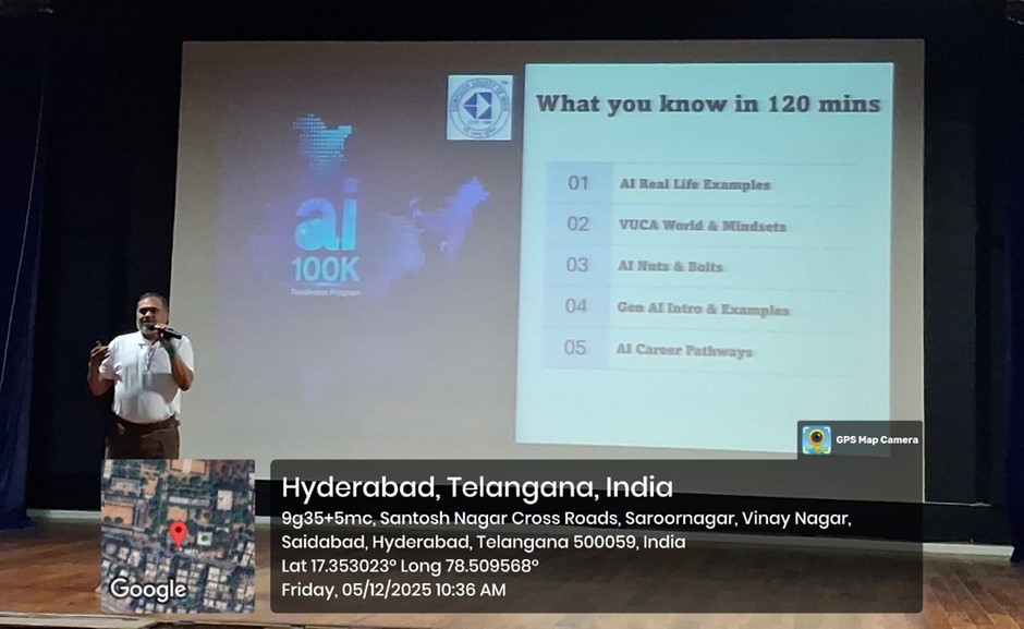 Principal’s Address Dr G Shyama Chandra Prasad, Principal, addressed the gathering and highlighted the importance of early exposure to AI and the role of CSI in building student capabilities. He encouraged students to develop strong technical foundations. Chief Guest Address & CSI SBC Inauguration Dr D V Ramana, Secretary, CSI Hyderabad Chapter, was the Chief Guest for the programme. He formally inaugurated the CSI Student Branch Chapter (2025–26) and spoke about CSI’s contribution to student development, professional ethics, and continuous learning. Distinguished Guest Speaker Dr Kalyan Sarvepalli, Senior Digital Transformation Specialist, Infosys, shared insights on global AI adoption and emphasised the need for computational thinking, data-driven decision-making, and adaptability in modern engineering careers. Guest of Honor Mr Yadunandan STVSS, VP – Hexaware Technologies & CTO – OneAutoMax, interacted with students on emerging industry expectations and essential digital skills. He motivated students to stay curious and technologically aware. Keynote Address – AI 100K Programme The keynote session by Mr Sai Bhanu Madhav, Principal Consultant, Infosys, provided an impactful overview of the CSI AI 100K initiative. He explained the programme’s structured learning path, covering Python, data analytics, machine learning fundamentals, and real-world AI applications. Key Highlights
