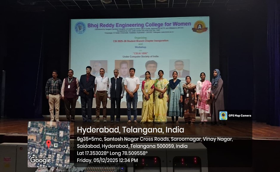 Bhoj Reddy Engineering College for Women, in collaboration with the Computer Society of India (CSI), Hyderabad Chapter, organized the CSI AI 100K Workshop along with the CSI Student Branch Chapter (2025–26) Inauguration on 05 December 2025. The AI 100K initiative, recognised as the world’s largest AI readiness programme, aims to train one lakh students in Artificial Intelligence fundamentals and applied skills. The event was conducted exclusively for first-year students to introduce them to CSI activities, AI learning opportunities, and industry expectations related to digital transformation. Participants: I B Tech CSE, CSM & IT Students